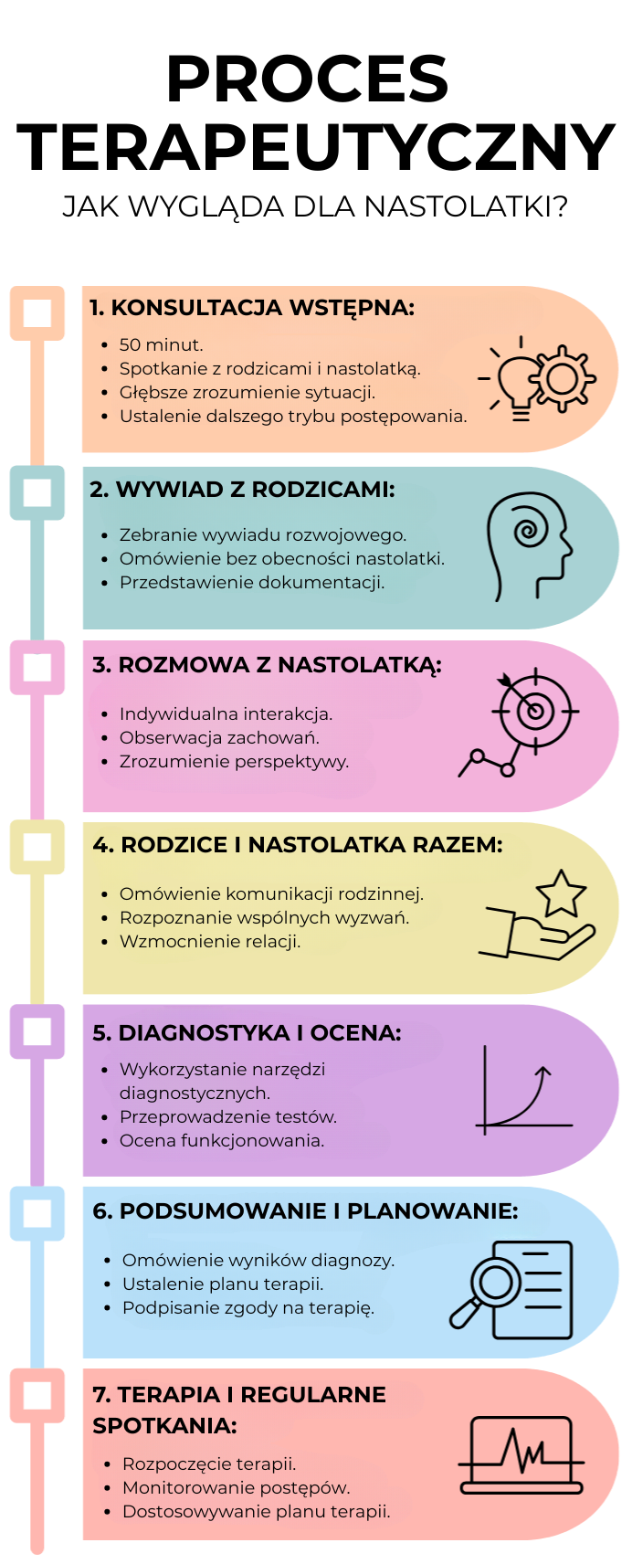 Nastolatko, Rodzicu pamiętajcie, że konsultacja nie jest wiążąca. Jeśli w trakcie rozmowy stwierdzisz, że nie czujesz się dobrze lub po prostu nie nadajesz ze swoim terapeutą na tych samych falach, możesz zrezygnować lub umówić się do innego specjalisty.